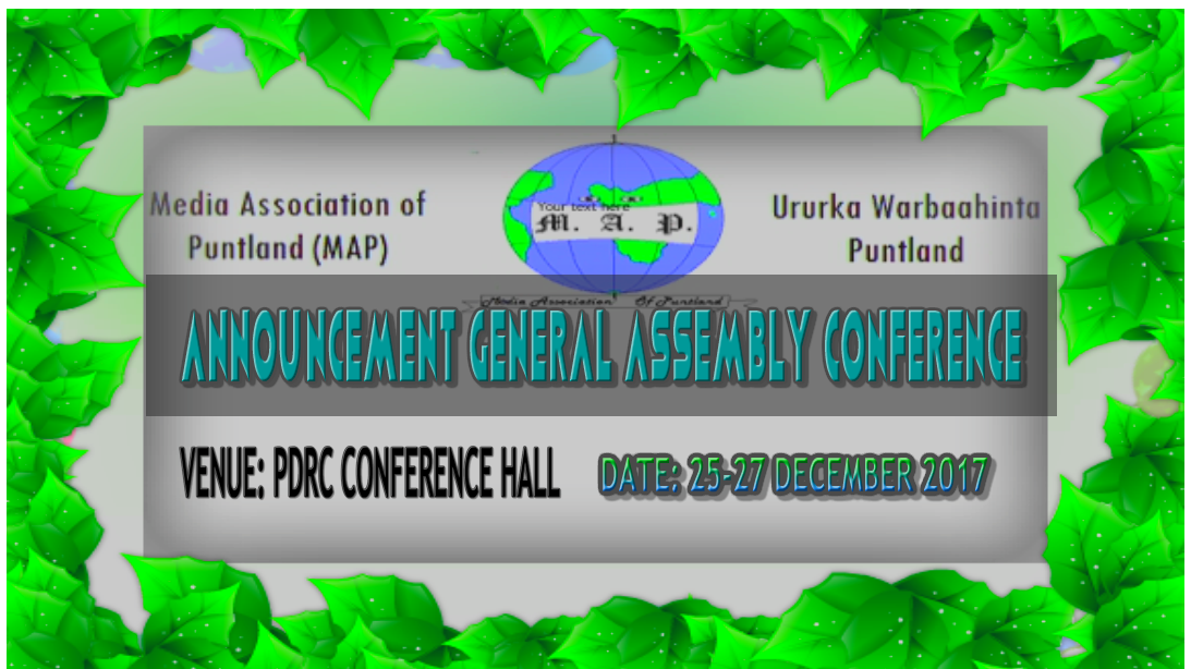 Garowe, December 19, 2017: The Media Association of Puntland (MAP), has officially announced that the Association will hold its 3rd General Assembly Conference from December 25-27, 2017 at the Puntland Development Research Center (PDRC) conference. MAP’s third General Assembly is proudly supported by the National Endowment for Democracy (NED) and Free Press Unlimited. Both organizations are giving partial support to MAP’s GA activities covering capacity building activities and logistics support, which will help MAP cover the expenses for the conference expected to invite over 75 delegates drawn from all types of media practitioners across the Puntland regions to attend the GA activities. Among the MAP 2017 GA programs are: a. Chair; b. Vice-chair; c. Secretary-General; d. Treasurer and 5-Board department directors. 8. Handover to the new Board of directors. The agenda will be shared amongst members prior to and on the day of the AG conference. Similarly, attendance will also come from our international partners, State authorities, Puntland Parliamentarians, Human rights groups and civil society umbrellas in Puntland. About MAP Our Mission Values Advocacy – A top priority for MAP is to advocate for the enjoyment of human rights, peace, democracy, and social justice in Puntland and Somalia at large Solidarity and participation – collaborating and networking with national and international media society and stakeholders to build strong, vibrant and democratic media voice with solidarity, coexistence and equitable access of information. Democracy – MAP decision-making process is based on a democratic system of majority choice where all members respect freedoms, opinions, and decisions of others. Innovation – promoting the discovery of new ideas and developing beneficial workable approaches for our members and greater media society in Puntland. Integrity – MAP’s existence is powered by strict principles that are free from discrimination based on religion, political, view, gender, and ethnic background, cultural or social class. Professional Journalists and members ofMAP are obliged to follow those principles and implement activities with integrity, decency and respect the dignity and intelligence of the beneficiaries and thus is devoted unwavering commitment in defending and promoting freedom of expression based on the principles of human rights on the freedom of expression and social justice through professionally ethical media Core activities of MAP focus on press freedom, preservation of journalists’ rights, skill training on professional journalism, building a united voice of journalists, forming a foundation for cooperation and confidence and dialogue engagement on legal & policy reforms. It fulfills these activities through advocacy, training needs assessments f the journalists, organizing workshops, seminars, conferences, dialogue engagement with authorities and systematically monitoring, investigating and reporting violations of press freedom. MAP also exists to develop and capacitate the institutional performance of the media houses in Puntland. ********************************************************END*********************************************** |