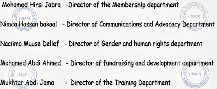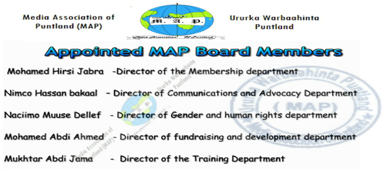 The Media Association of Puntland (MAP) would like to thank the outgoing board for their commitment and performances during the past years and wishes them a fortune in their future endeavors.