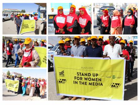 en and women in red t-shirts and yellow caps, walked through the main roads of Garowe with the sole aim of showing solidarity to female journalists.